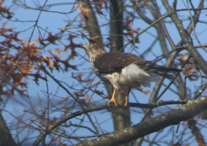 This morning I have the windows open so the cats can look out and so I can let the fresh air in. A few minutes ago, I heard Murphy crying like a baby from the window sill. So I looked out, then up and…wow! This lovely creature and two buddies were bouncing from limb to limb along our woods line. This was the only photo I managed to take before they flew off. So it was over in a flash. But those are some nasty talons. No wonder Murphy is still jittery.