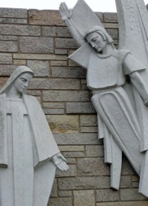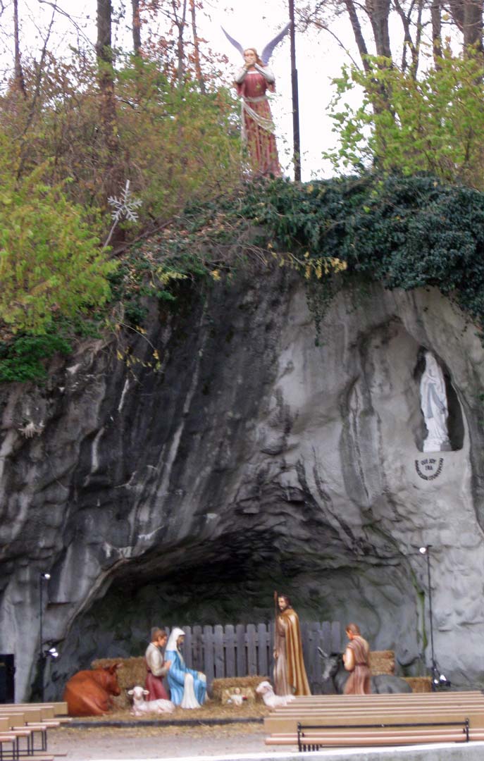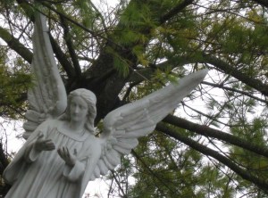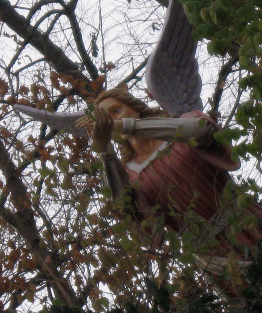 The chill finally got to me and I headed back to the car. My next stop was the annunciation wall — my original destination. One thing I appreciate about the Catholics is their tendency to kneel when they pray. There are kneelers at all of these little shrines. I actually took advantage of this one. Then I headed back to the car. On my way out, I saw this angel up in a tree.