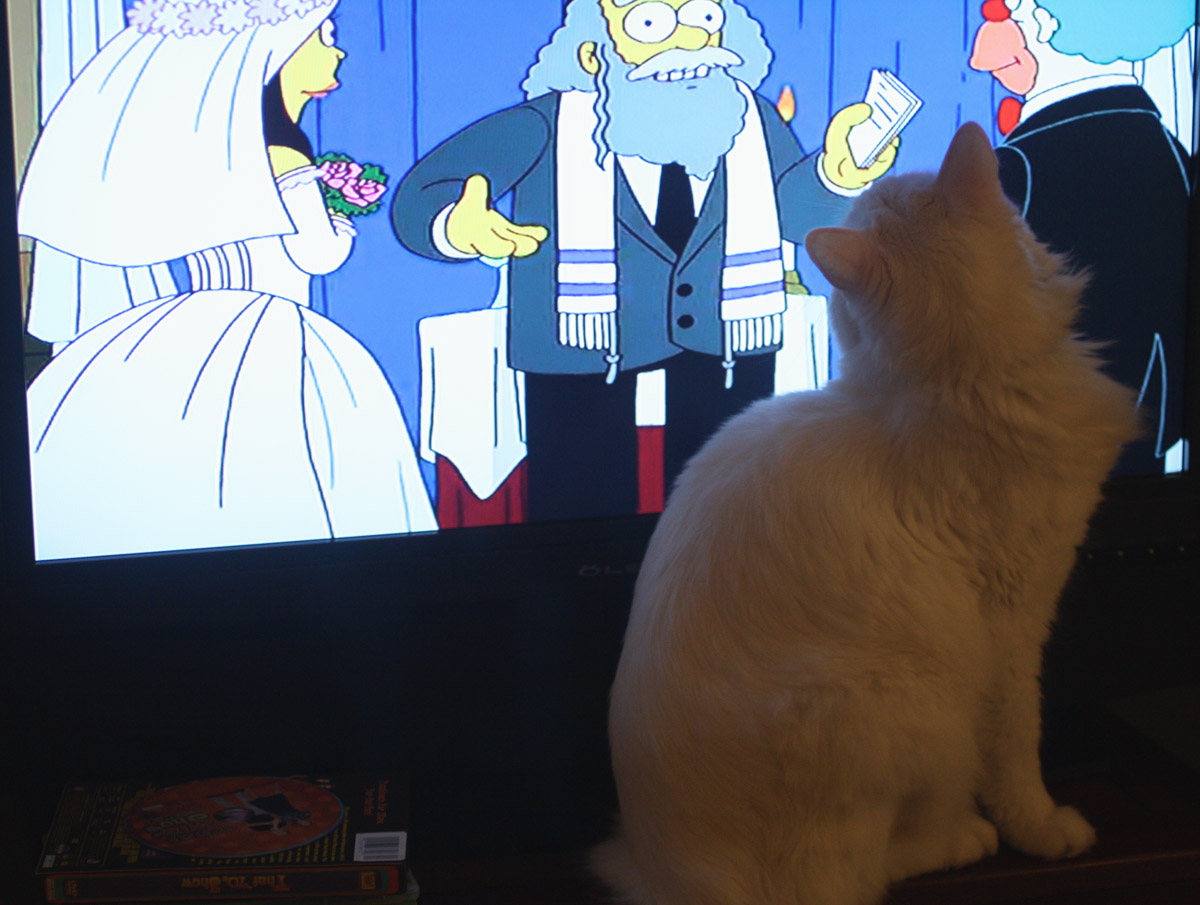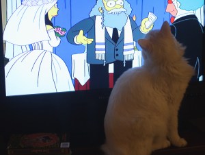 Now we’re home again and our ding dong cat is watching the 20th anniversary episode of the Simpsons. See? That animal will watch anything.