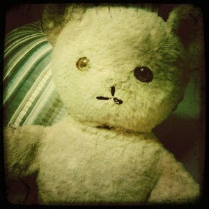 Can you tell this guy has seen many a puddle from me? His neck is ripped, his nose is missing and the patches of fur are worn off. But I love him. His music box can’t be wound up to play, but every now and then, you can hear a few soft, random pings from him. It’s rare, but from time to time he decides that he has something to say. It’s like a little gift.
