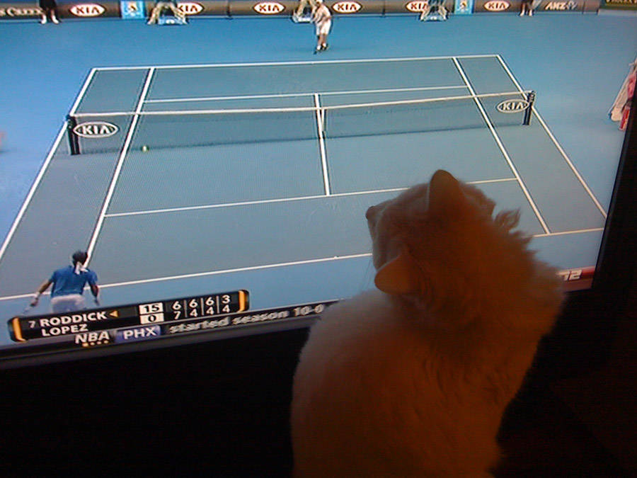 Now that this crazy week has come to a close, hopefully I’ll get to watch the Australian Open this weekend (albeit over Murphy’s head more than likely). This was Murphy earlier this evening. Replay of Roddick’s match from last night. Late last night. I love tennis, but this Slam is the worst one for productivity because the coverage goes so far into the night. I’ll-just-watch-one-more-game-then-I’ll-go-to-bed turns into two games…then three games…then a set…then another set…and bam, it’s midnight. Then the next morning I feel like I’ve been hit by a truck. I’m too old to pull late nights any more.