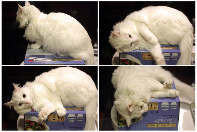 Murphy’s new favorite spot — he even naps here. This box has been sitting on the counter since the holidays because I don’t want to adios his perch. (Okay, the box is still sitting there because it’s cookware and I, well, haven’t cooked anything more complicated than a crockpot meal. Murphy is currently getting more use out of it than me, so there’s no point in moving it.)