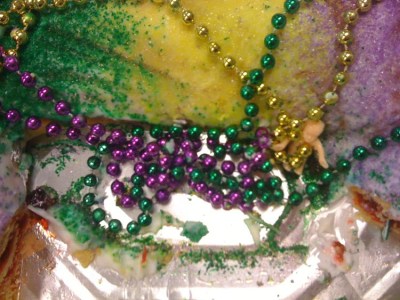 It wasn’t the king cake that confused me — I figured it was from an over-the-top Super Bowl party thrown by a Saints fan. What I couldn’t figure out was the location of the baby. I’ve not seen a lot of king cakes, but I was pretty sure that the baby is supposed to be baked inside the cake — not stuck to the outside. So I looked it up when I got home tonight. Okay, so I’m not crazy. The baby needs to be on the inside. Oh well. Since no one will get the baby, everyone is off the hook for supplying next year’s cake.