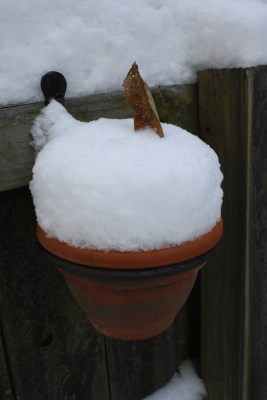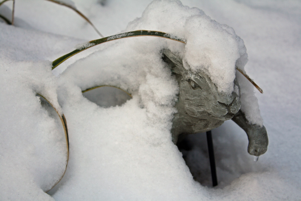 Not that it matters, but why/how is this leaf stuck upright in the snow? I didn’t put it there. And Garden Bunny looks like Mr. T — only without the chains.