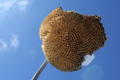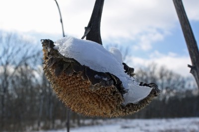 This large lake is surrounded by picnic tables and benches. It’s really lovely. We’ll have to go back this summer. But I also want to go back this summer to see the area’s sunflowers in bloom. Today I saw an entire field of these bowed, snow-covered flower heads.