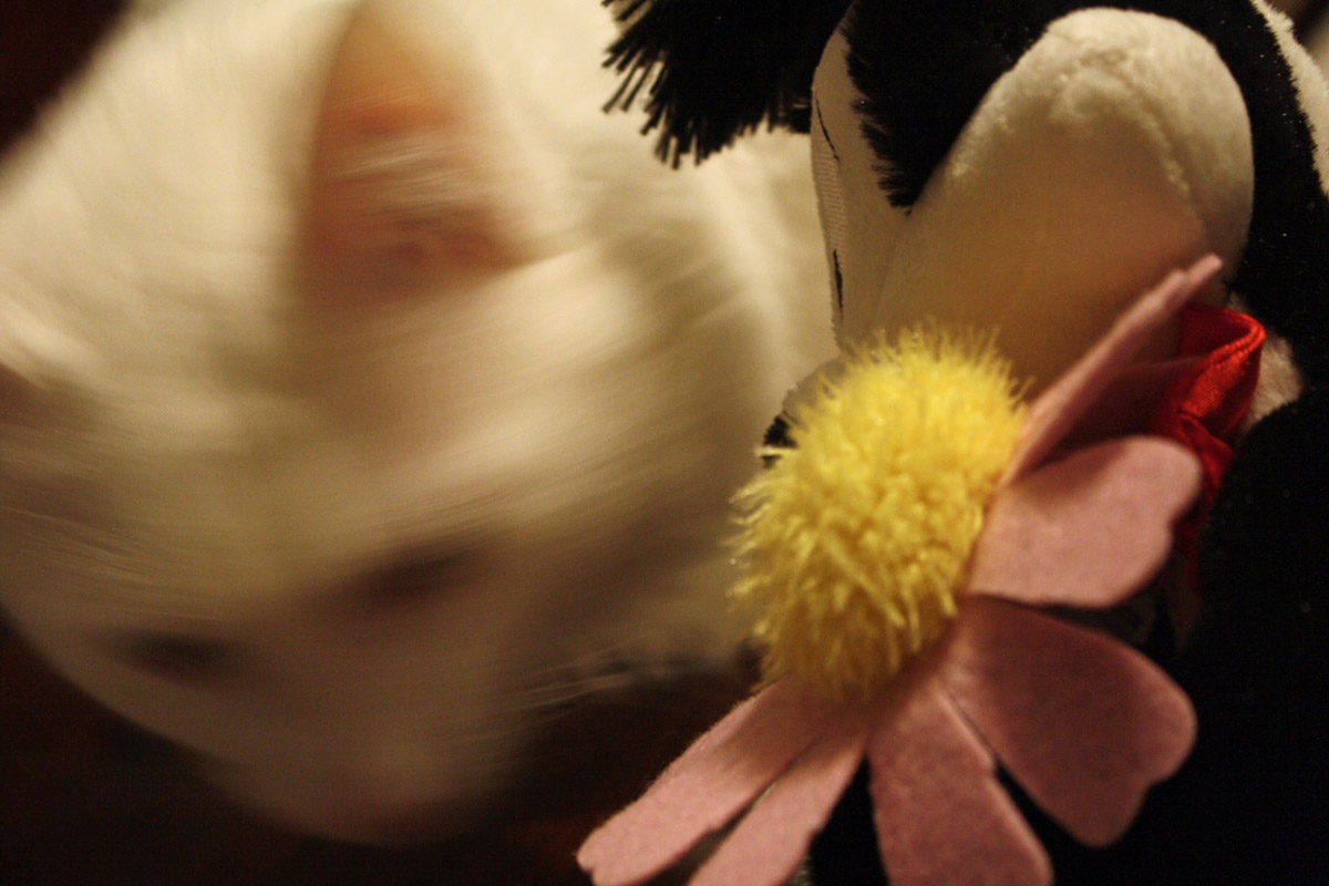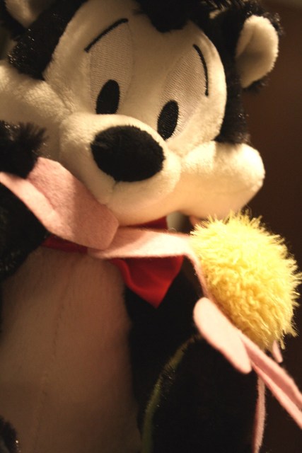 Leave it to my Mom to find me a Pepe LePew for my birthday. He is so cute, picking his little flower petals. Press his foot and he talks. “I love you” was his first comment to me. Yay! I love you, too, Pepe…and my Mom. Although the voice box really freaks the cats out. So of course I play it often. I can be kind of bad that way.
