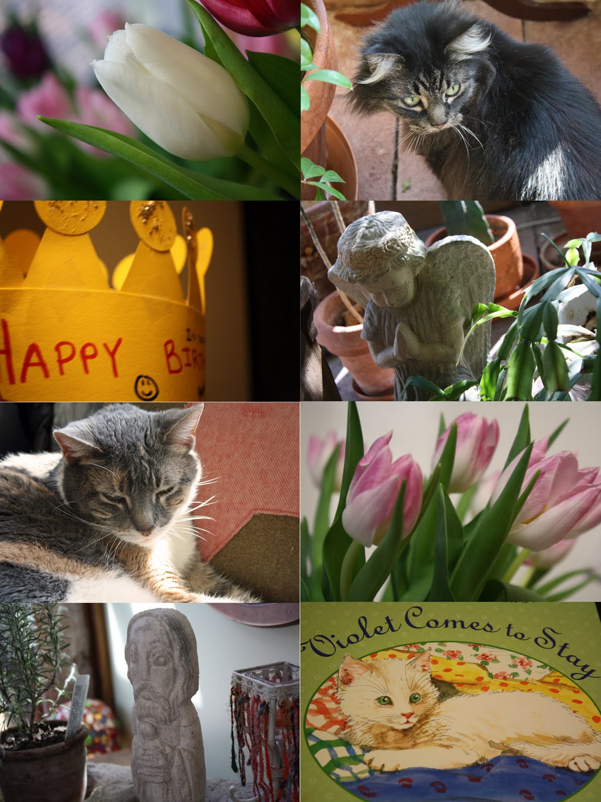(clockwise, from the top left) one of three bouquets of tulips, one of the kitties who joined us for lunch at my boss Suzy’s house; angel from Suzy’s sunroom; more tulips; a children’s book that is clearly meant for me; lovely arrangement in the sunroom; sleepy kitty; crown made for me by a sweet friend of Drew’s.
