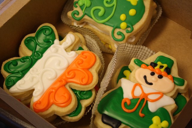 When I picked up these St. Patrick’s Day cookies at a local bakery/coffee place, there were several tables filled with older gentlemen/retirees. I gathered from their argyle sweater vests and perfectly creased slacks that they belong to the country club set. As I headed to the door, I had to step over an extension cord leading to one of their tables. High tech retirees with laptops, maybe? Uh, no. The extension cord was powering a magnifying lamp. One of the dudes was using the lamp to cross stitch a design that read, “I love golf.” So here goes: