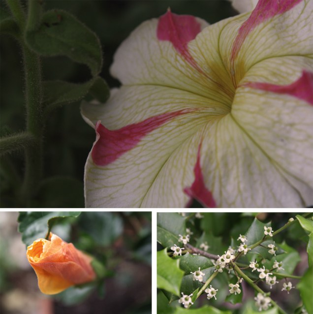 Our neighbor is a lovely, warm-hearted widow with a green thumb and unique taste in flowers. I have an open invitation to take photos of her garden that I put to use as often as I can. The photo with the little white flowers is actually her holly tree. Holly trees have flowers? Who knew?
