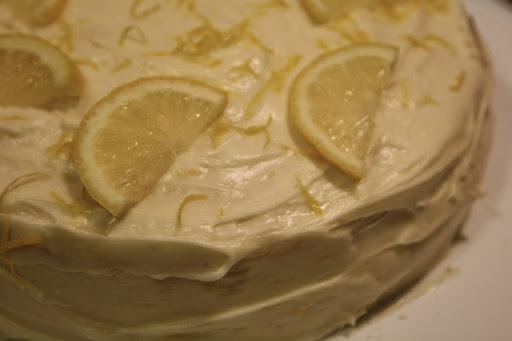 And Lorraine’s selection for her birthday cake is of the lemonade variety — her favorite. Wanna know why I make cupcakes instead of layer cakes? It’s not for portion control. It’s not even for the super cute cupcake liners. No, it’s because almost every time I make a layer cake, I break one or both of the layers moving it from the pan to the cooling rack. And tonight was no exception. Fortunately I was able to cement the thing together with frosting, but it still bummed me out. This is going to the office tomorrow (in a brand new cake tote) to keep the celebration going.