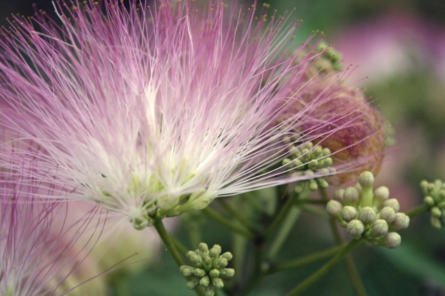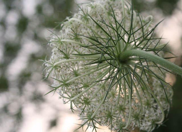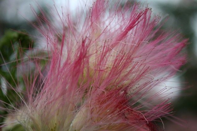 Really quick walk tonight and I saw all kinds of stuff. Baby bunnies bouncing around, seven deer chomping lazily on the nature center’s landscaping, a ginormous raccoon skulking about and lots of new flowers and trees blooming. I’d never noticed before, but Queen Anne’s lace looks so much prettier from the back. And a certain row of mimosa trees looks like it is exploding right now. Normally I love them, but tonight they drudged up the weirdest thought. They’re so beautiful and exotic from a distance, but when you look at the flowers up close, the blooms actually look a little bit like the fiber optic centerpiece that belongs to my former father-in-law*. Creeped me out a bit**.