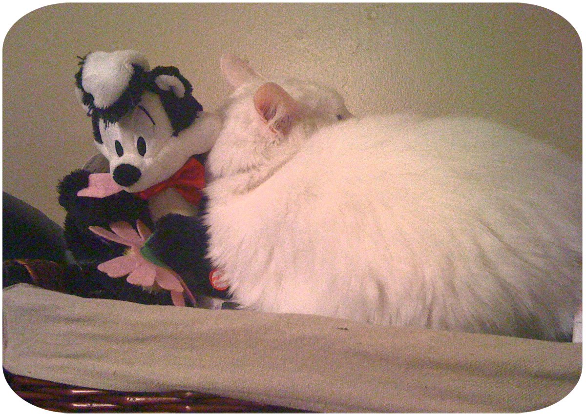Murphy’s latest napping spot. My basket of DVDs that sits on top of the tallest chest of drawers in my room. (Although he usually doesn’t tolerate Pepe. He typically knocks Pepe to the floor.) Seriously, the cat jumps onto the foot board of my bed, stares up at the basket, shakes his rear end and makes his leap. I haven’t seen how he gets down, but it’s gotta hurt.