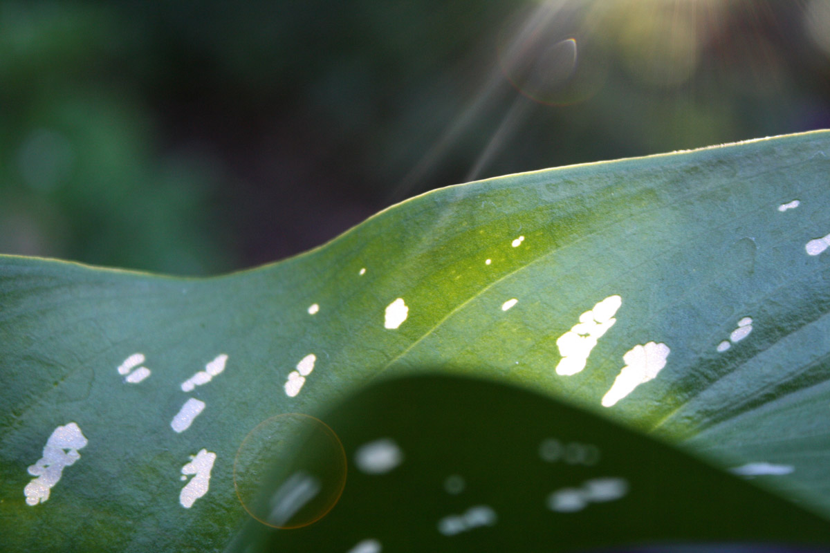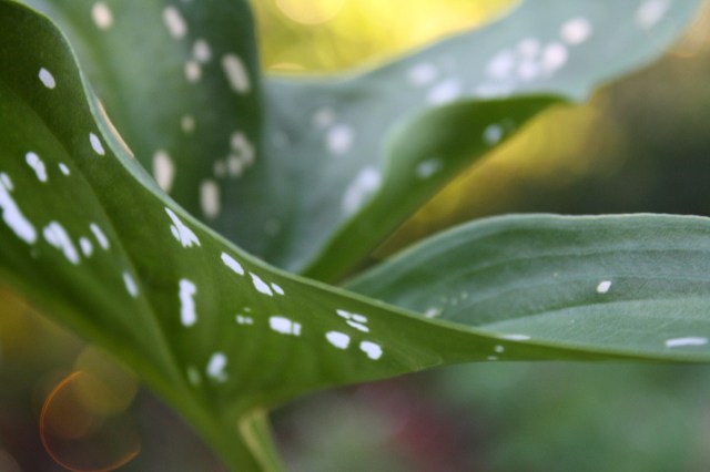 Oppressively, outrageously, obnoxiously hot today. And the bright side is just that – bright. Lovely afternoon light on the neighbor’s calla lily leaves. I wish I could’ve gotten a really, really, really close photo of the little white spots on the leaves. They’re actually semi-transparent. And I couldn’t tell for sure, but when the sun hit just right, I thought I could see water glistening inside the spots. Sparkly and way cool.