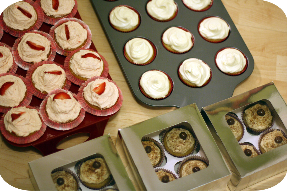 Yesterday, I spent close to twelve hours working on one necklace and matching earrings. Today, I went to the office and worked for half of the day, then I came home and started baking cupcakes for a baby shower tomorrow. In all, the cupcakes took eight and a half hours. I’ve been working non-stop from a.m. to p.m. for two days straight and I have one necklace (that STILL isn’t finished), one pair of earrings, one work project and 36 cupcakes to show for it. That sure doesn’t seem like much when you do the math. In my defense, cupcakes and frosting were all made from scratch — and some of the cupcakes were a little complicated. The strawberry shortcake (above left) and the tiramisu (front in boxes) cupcakes both had to be hollowed out and stuffed. (Above right is a basic lemon buttercream.) But still.