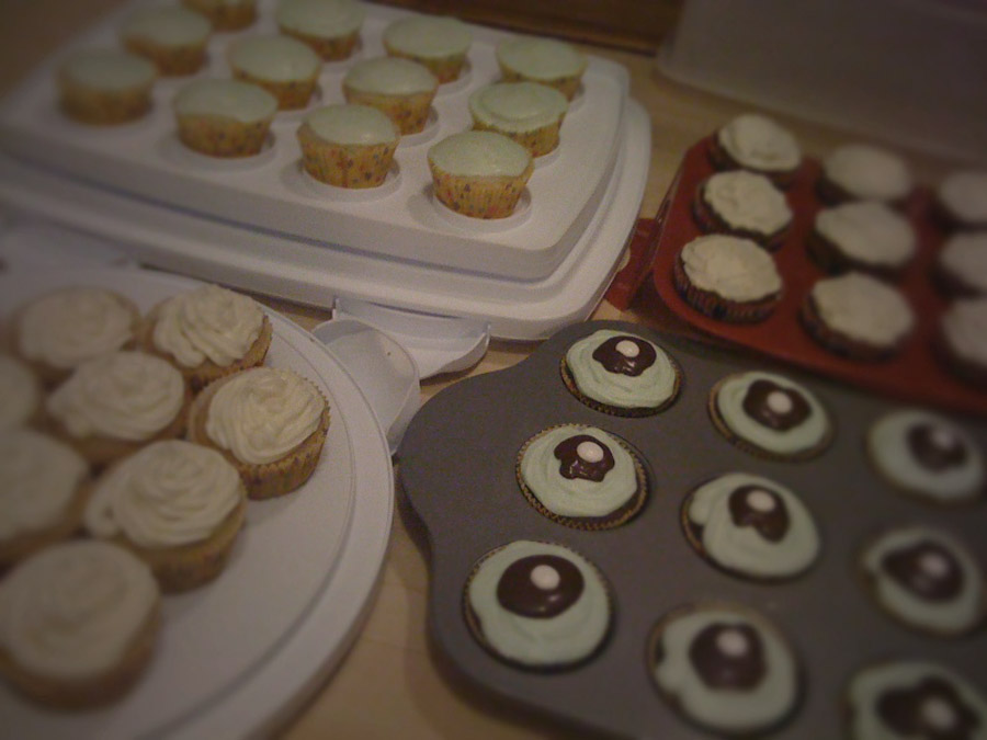 Clockwise from the lower left: lemon buttercream, margarita, crimson velveteen, chocolate mint. All baked this evening for a work thing tomorrow. Not feeling the cupcake love right now. Six dozen in two days is a whole lot of a good thing.