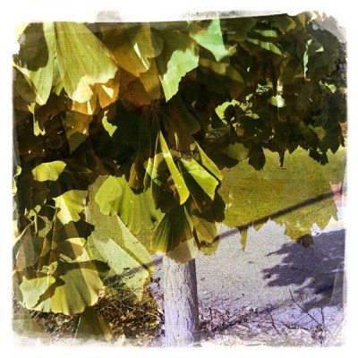 On the way to work this morning, I saw a tree that appeared to be shedding its leaves. Hundreds of leaves were falling so briskly that it reminded me of a dog shaking water out of its fur after a swim. It was like the tree was surrounded by a curtain of orange and yellow. It’s so weird to think that trees are able to just up and decide that they’re ready to shed. The leaves have absolutely no say in the matter. This little gingko tree at the neighborhood craft store seems to be content with its cover. But I’m guessing they’ll be parting ways soon. I read the best explanation of the whole leaf-loss process today. As I drove by the house with the two yellow labrador retrievers, I saw one of the dogs romping and playing in a freshly raked pile of leaves. So darn cute.