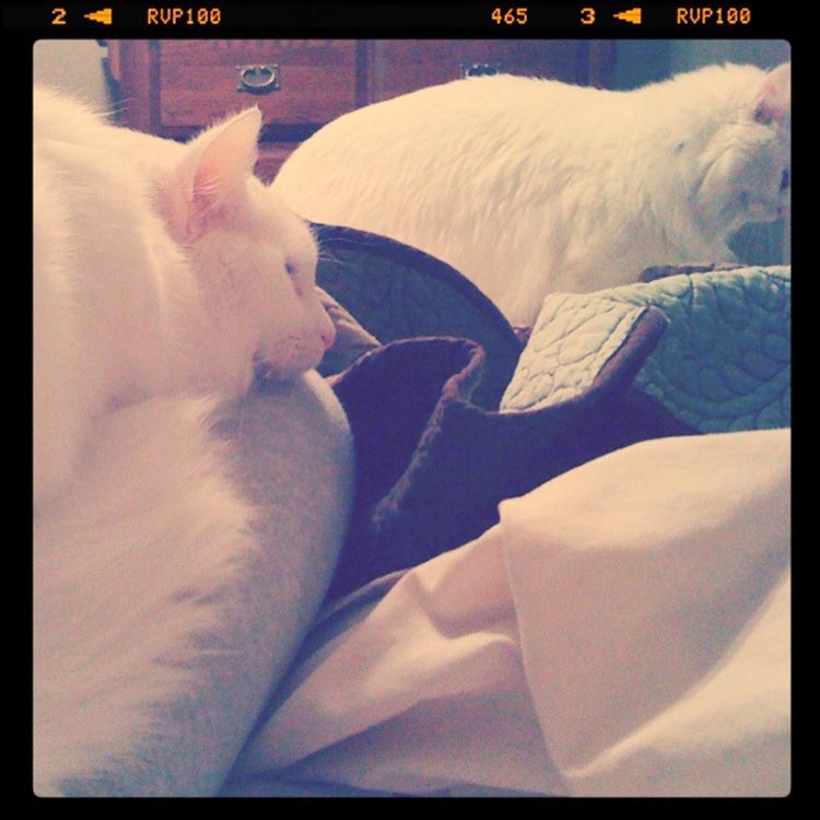 Notice anything strange about the big cuddly pile of kitties on my bed? Specifically, something strange to the left of the photo? That’s Murphy. And my leg. That cat can nap comfortably anywhere and on absolutely anything. But I love listening to both cats when they nap. Murphy sounds like microwave popcorn when it’s almost finished popping. Violet sounds just like a weedeater.
