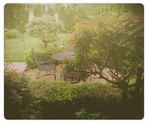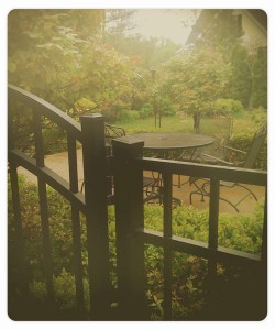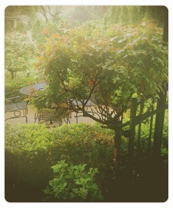 Celebrating a birthday, the office went to a new place for lunch on Friday. Inside and out, it looked and felt like it belonged in another country – in a really good way. The weather was icky, so I didn’t take many photos. Because the ones I did take were hurried, I figured they were awful and I didn’t even bother to look at them until today. What a pleasant surprise! I thought they were kind of mystical-magical. Thank you, rain and mist. Who knew?