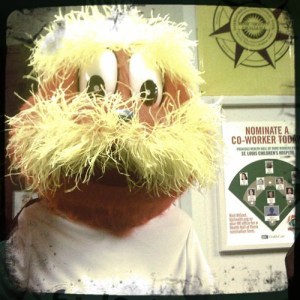 Another day at the hospital. Saw the usual character art — as well as a fun mascot-character-guy down by the cafeteria. He made me smile. And that’s a big deal in a place like that. We spent the day in the same surgery unit as the one from three years ago – and even walked by our personal waiting room from that day. But today was different. Instead of an eight-plus-hour surgery with an uncertain outcome and a week-long hospital stay, this was an outpatient surgery. We were there all day, but we got to come home tonight. We’ve got a long road of chemotherapy ahead of us, but I’ll take what we did today over that day three years ago anytime. But rather than attempt to untangle a string of mixed emotions right now, I think I’m going to say a quick prayer of thanks and go get some sleep in my own bed. Because I can. There are plenty of families that we saw in the waiting rooms today who aren’t sleeping at home tonight. These parents are (sort of) sleeping sitting up in awkward chairs, refusing to leave the bedside in an effort to bring comfort to their kids and themselves.