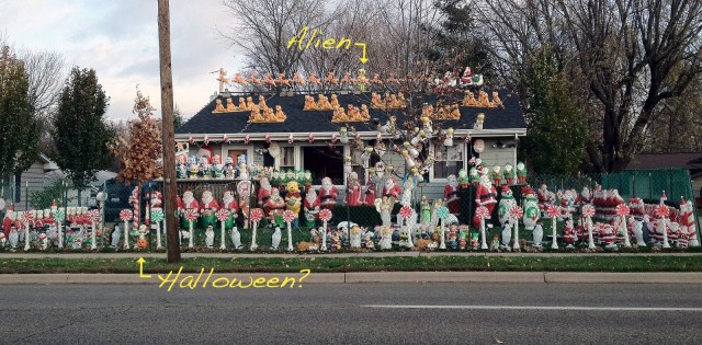 I’m sorry, but I thought this deserved its own post. I saw this yard on the way home from Illinois this morning. The photo simply does not do this justice. Although the photo has allowed me the opportunity to play “guess which ones don’t belong” now that I’m home. I’m sure there’s more, but here are the two most obvious misfits.