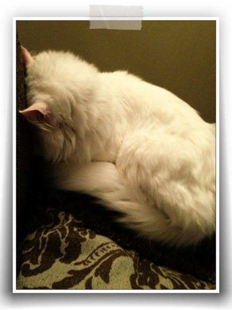 In case it’s hard to tell, our weird cat is napping on the arm of our sofa with his face smashed into the back cushion. I’m chalking it up to the fact that he’s tired of watching football, but no one knows for sure why he does this. Another popular theory is that he’s pouting because I denied him leftover turkey.