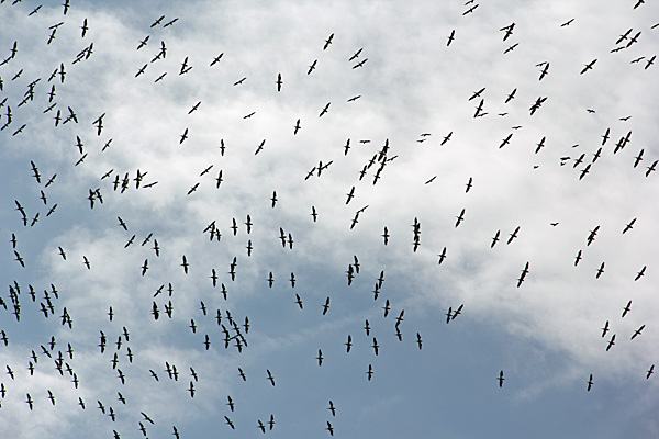 I managed to pull my car into a parking lot and snag a few photos that don’t begin to do this justice. (By the time I parked, dug out my camera and got out of the car, they had ascended to a point that it was really hard to zoom in. Argh!) This mass of birds silently (seemingly aimlessly) swooped and looped through the sky. I saw at least three separate flocks fly towards the cluster from out of nowhere, join in the weird dance, then fly out the other side and go on their merry way. This may be a perfectly normal/natural occurrence, but I’ve never seen anything like it and it blew my mind. It was strange, awesome, and sublimely beautiful.