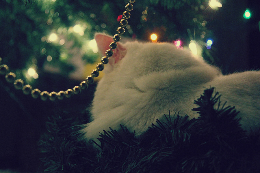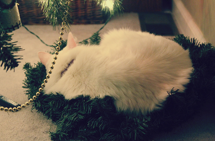It’s funny, but the cats napped under the glow of the tree quite a bit prior to me stowing an un-decked wreath underneath. Now she plants herself in the middle like 18 hours a day.