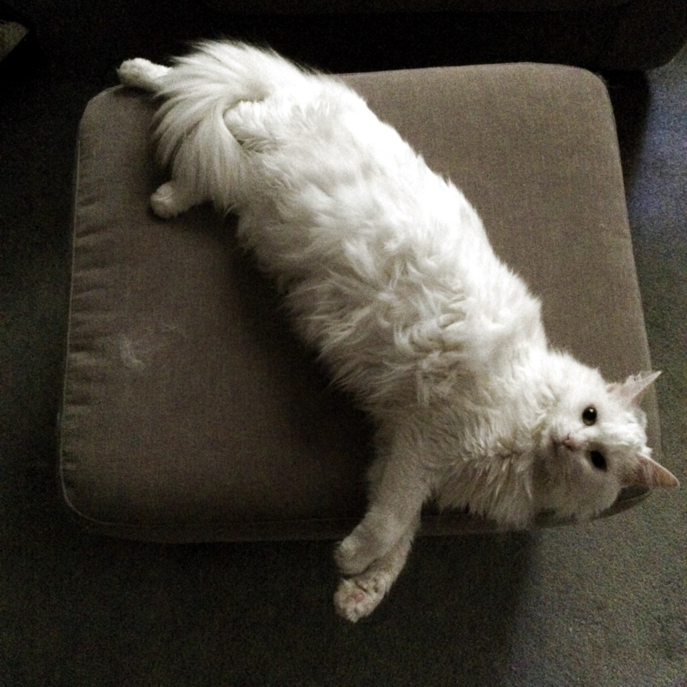 1.) The way my Violet assumes this position on my ottoman for morning belly rubs.