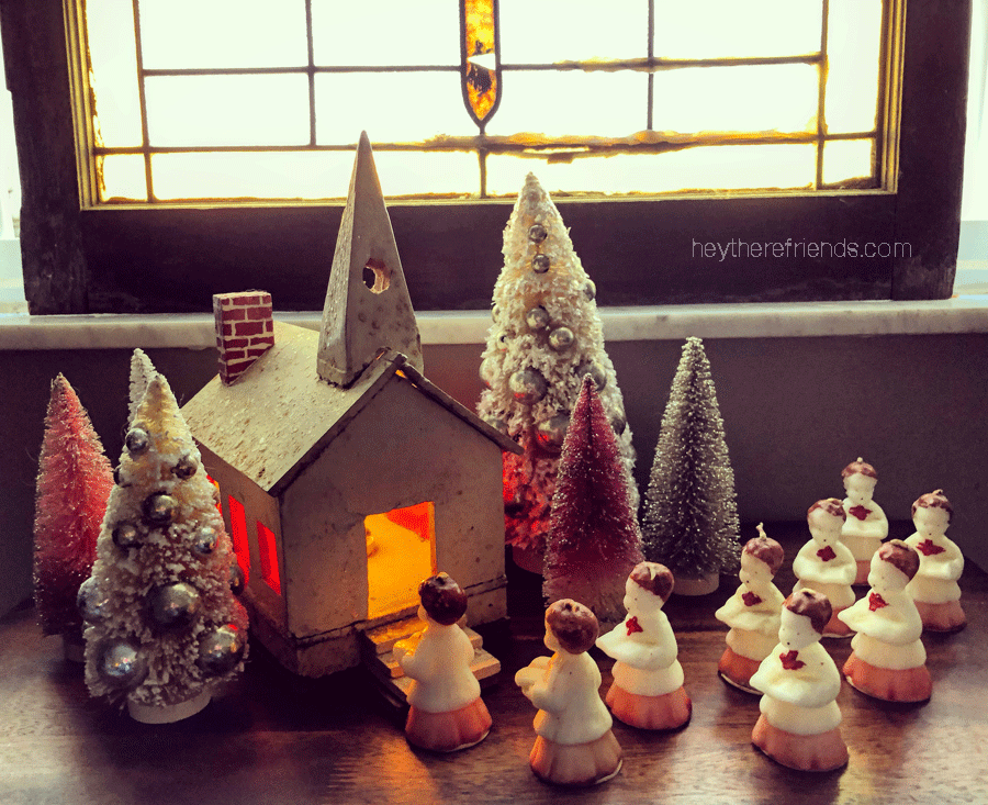 But the decoration that gave me greatest pause yesterday was this little Christmas chapel. My grampa made this for my grandma more than a hundred years ago and I scarcely have a Christmas in my memory without it. Also, tomorrow would’ve been my grampa’s 133rd birthday. Somehow we’ve been without him for 27 years. How is that even possible. I couldn’t help but think that, gosh, I miss him — and I sure think he’d love my boys.