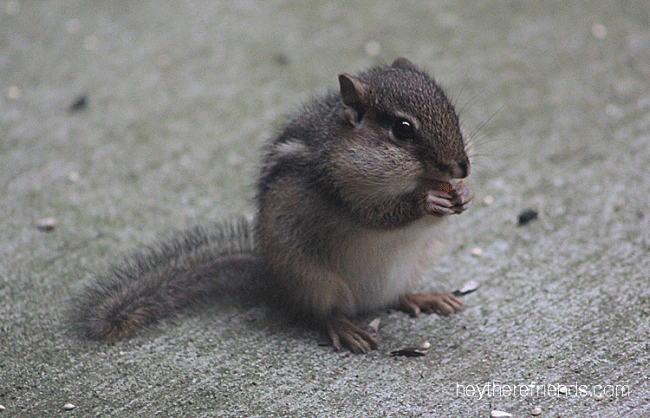 One of the baby chipmunks is a particular fan of the seed that drops from the feeder.
