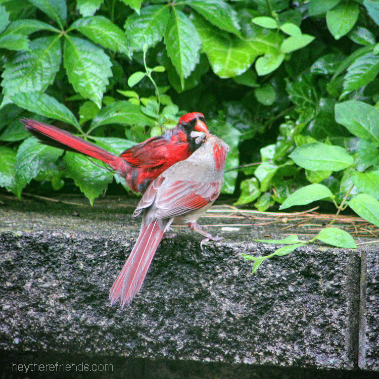 While imperfect, I finally got a photo of the male Cardinal feeding the female.