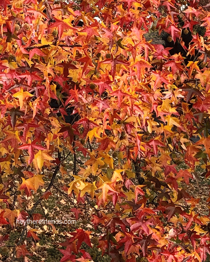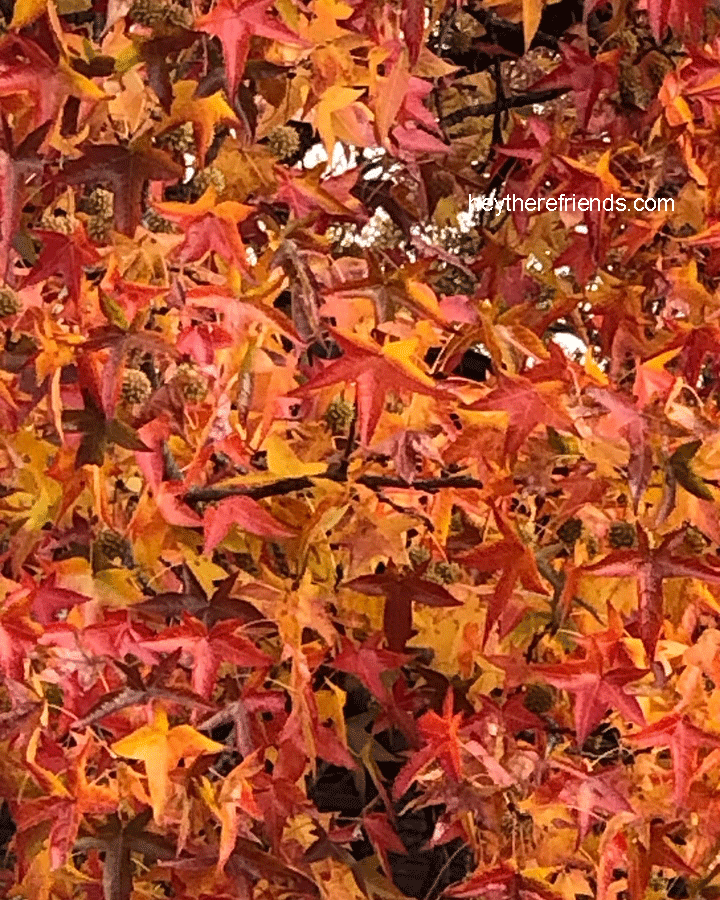 On the way to the office this morning, I realized how much being home for the last year and a half has made me enjoy getting out and about — so much that I even appreciate the stoplights along my route to work. I love to look around, see what’s developing (in nature or man-made). And check out these photos I got out my window at a stoplight this morning. There is an entire row of trees that has yet to shed, but boy, have they changed colors.