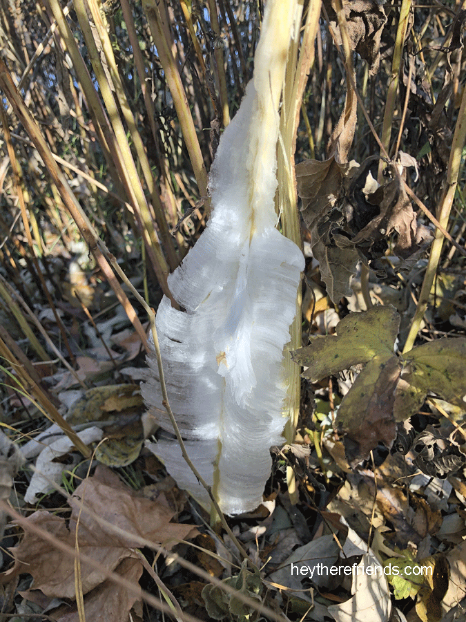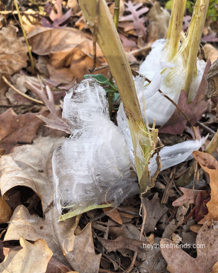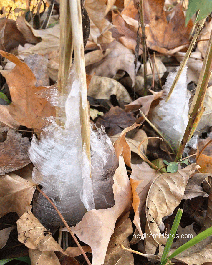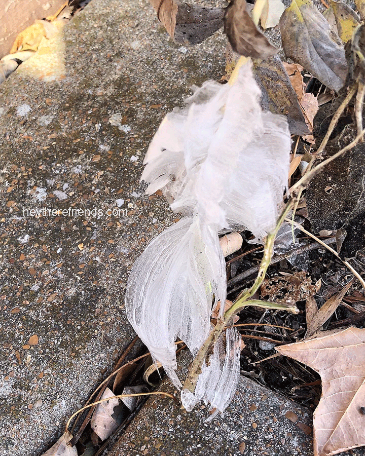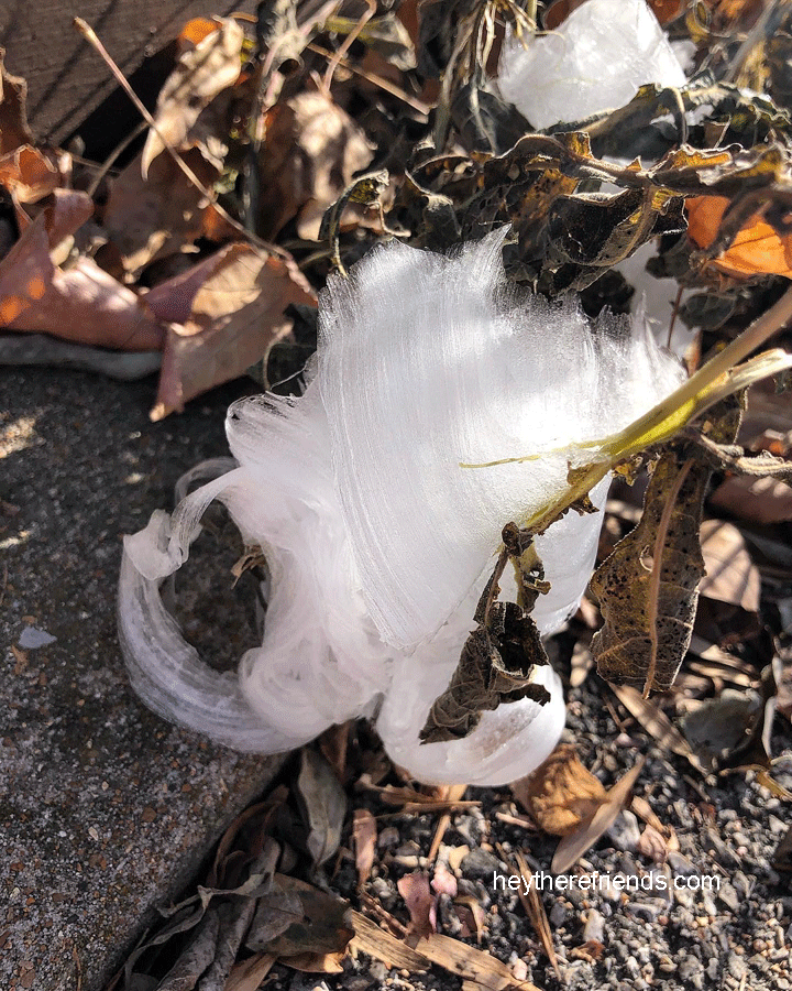 “While the plants’ stems are ruptured by the first hard freeze, the root system is still sending up plant sap from the warmer ground. The sap pushes through the broken stem and freezes on contact with the cold air. As more saps moves up, it forces the freezing stream of white ice crystals into ornate, folded ribbons that look like petals, puffs of cotton candy, or snarls of white thread.”