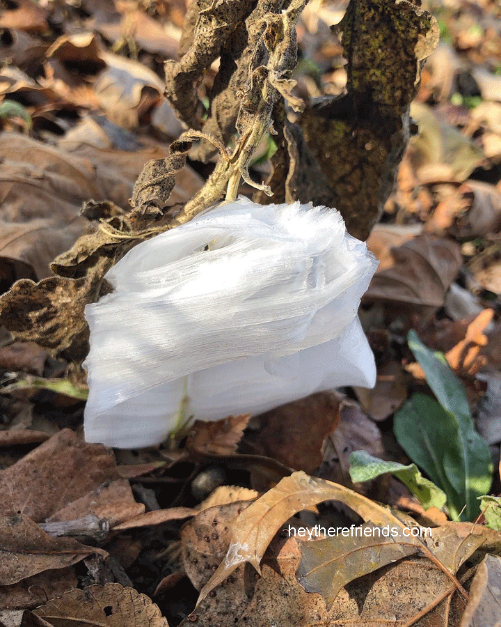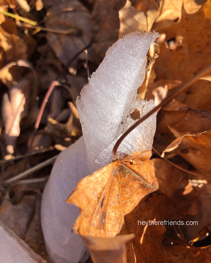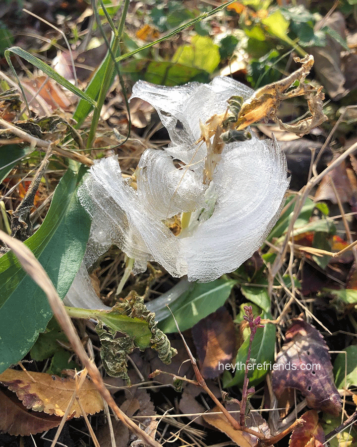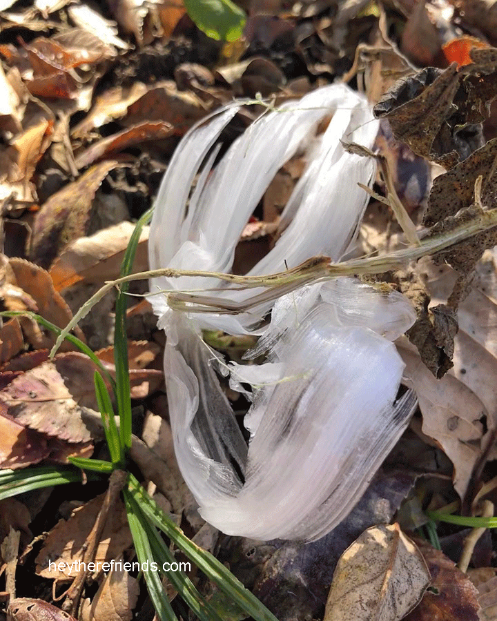 At first I thought someone had discarded some plastic wrap. But then I looked more closely and realized there was another piece of plastic nearby. And another. And another. Then it dawned on me…these were FROST FLOWERS!!! Not in the woods. Not early in the morning. In the park. In the afternoon.