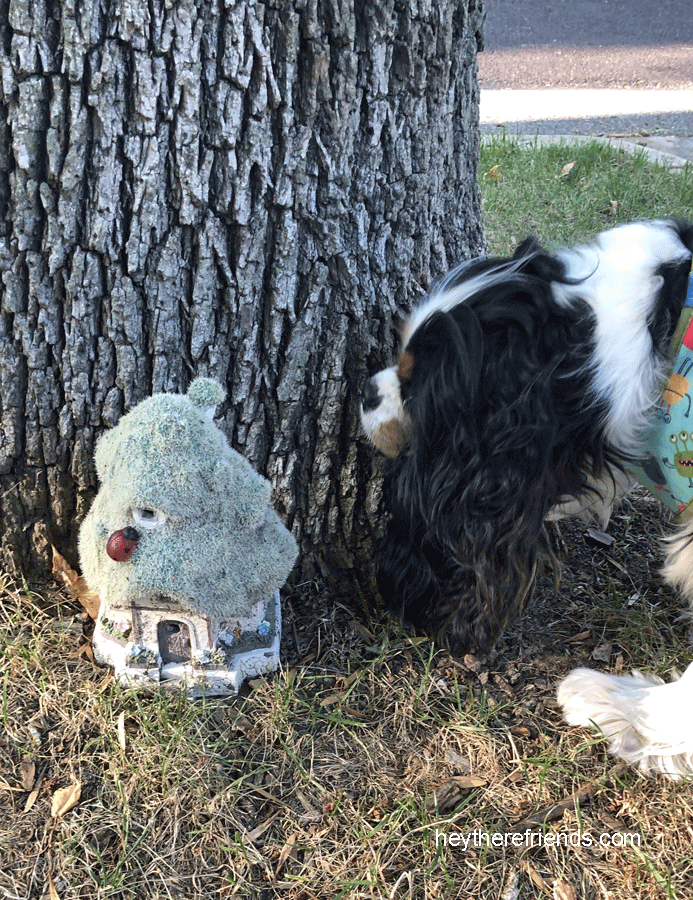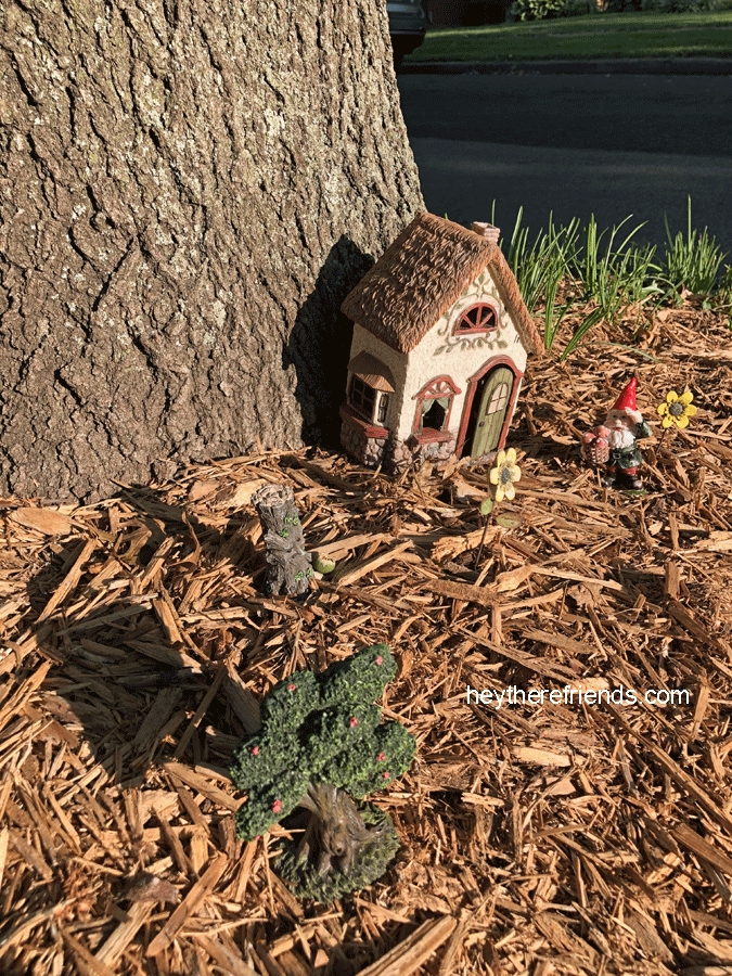 I knew there was a fairy house in a yard at a corner along one of my routes, but Finn discovered that we just needed to turn down the street to find an entire fairy village. Check out all of these! And we only went halfway down the street before turning back. Who knows how many more houses are actually there. How magical is this? Can you imagine how much the school children love seeing these as they walk to and from school?