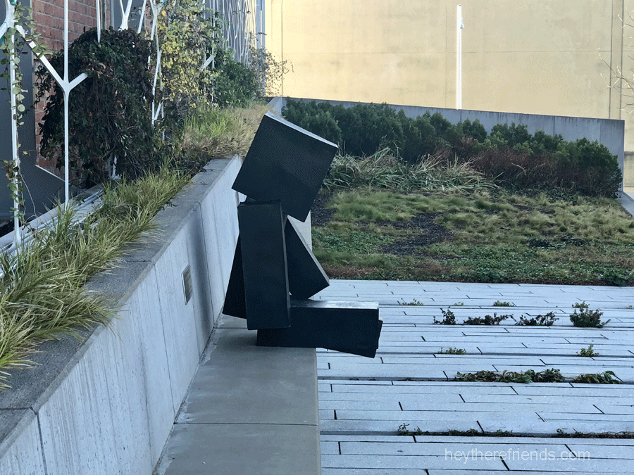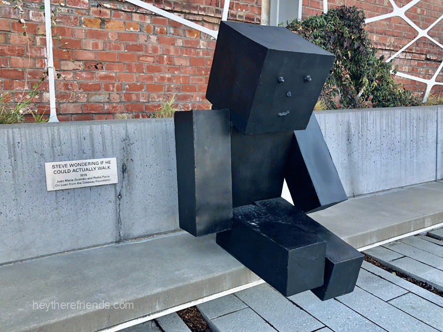 This first photo was my surprise and delight. The large block figure was so unexpected as I pulled into the parking lot. And the accompanying sign with the title of the piece was even more unexpected — and FUNNY. I couldn’t help but laugh out loud at the randomness of the whole scene. I actually said out loud, “You’ve got this Steve!” And chuckled even more.