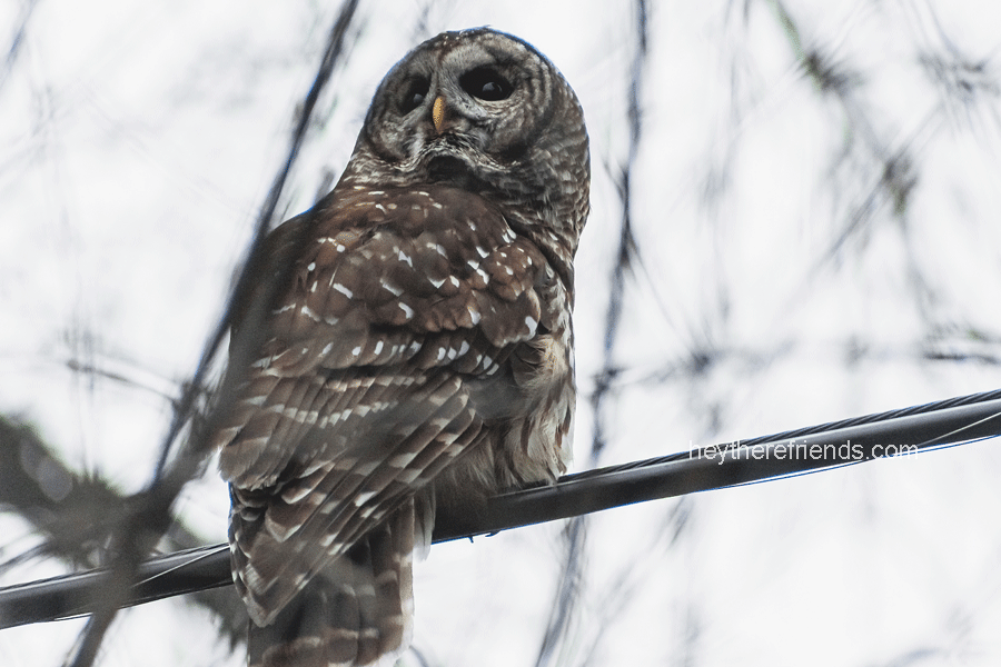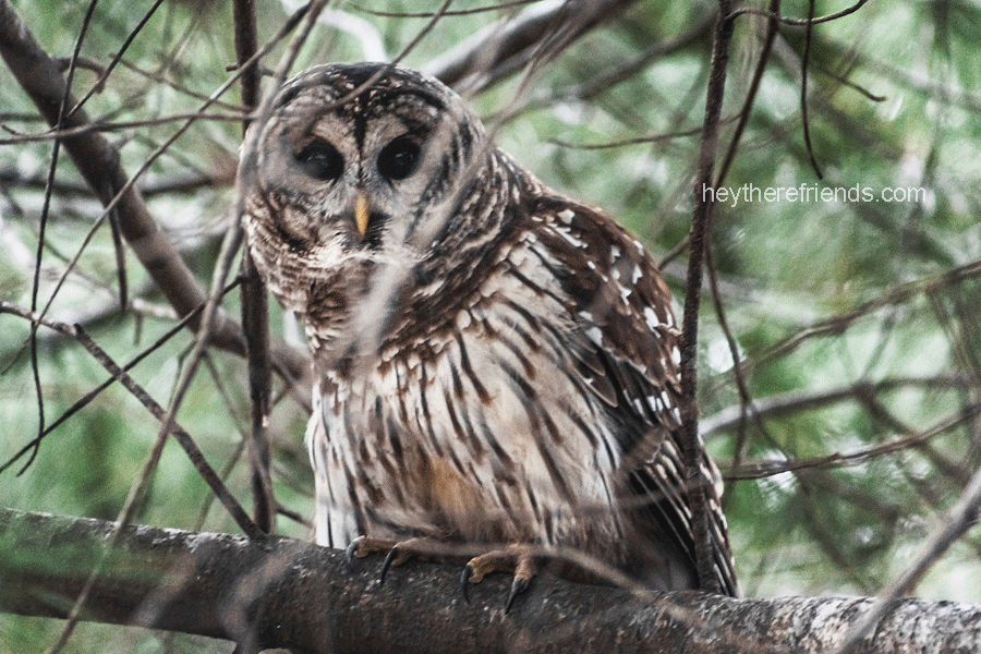 The crows eventually had him backed into some thick brush. Am I the only one who has never seen an owl’s profile? Doesn’t he kind of look like a cartoon character who flew into something face-first and got flattened?