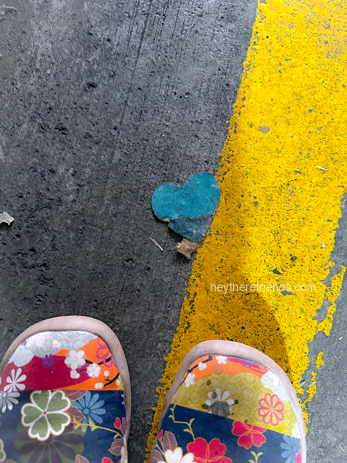 Almost at the height of my fear and anxiety, I spotted this little teal heart in a parking garage. It was on the ground right next to my car as I opened the door – and all I could do was stare in amazement. If you’ve been visiting this blog for any length of time or if know me at all, you know that spotting hearts is fairly commonplace for me. But this one was different. This was not something that resembled a heart or could be subject to interpretation: it was a heart. A dirty, tattered, water-stained little heart. And I knew in my soul that it was a message meant specifically for me: love is there…even when things are really messy. For the first time in quite a while, I exhaled. It was going to be okay. In some way, shape or form, it was going to be okay.