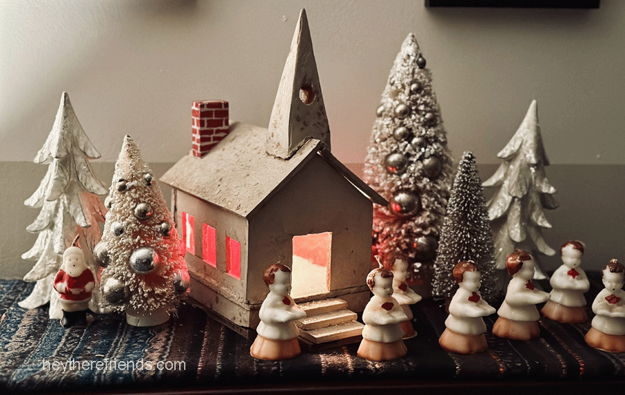 The fifth of 15 gratitude journal prompts is taking me to….my Grampa’s house during Christmas when I was a child. The little chapel pictured above is well over 100 years old, made by my Grampa as a tribute to the first little church he attended with my grandma. Every Christmas we’d make the drive to Grampa’s house and every year this little scene was displayed with care. My sister did a little digging and we figure that the choir children candles were made in the 1940s. This set (minus the trees — I added those in recent years) is synonymous with my childhood Christmases.