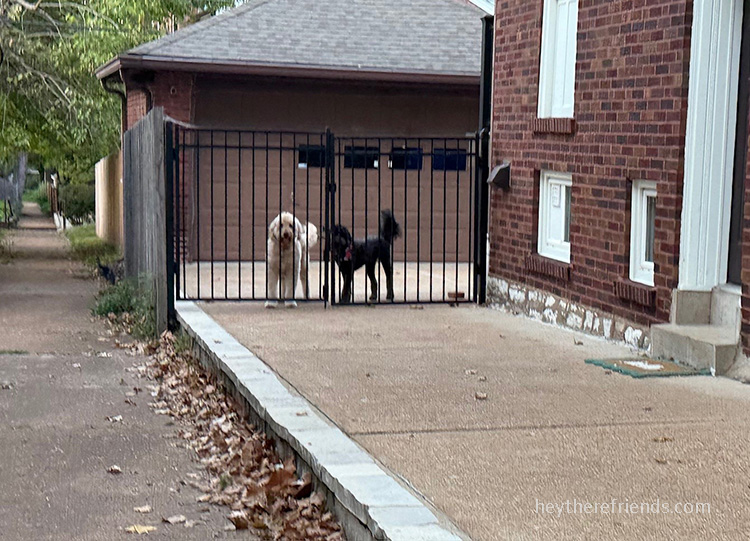 But I noticed a new development yesterday afternoon: it seems they watch and wait for us now. They sit at the fence, looking in the direction of our daily route. And when we turn the corner and come into view, the tails immediately start wagging.